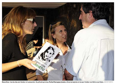 Rosa Díez, tras la cita con Haidar en Lanzarote. Su jefa de prensa, Maika Paniagua (izqda.), lleva la tarjeta en la que Haidar escribió a sus hijos. / JAVIER FUENTES