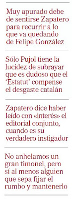 Entre tanto el gondolero había subido a bordo a toda la troupe del nacionalismo catalán, a ratos juntos y a menudo simplemente revueltos, poniendo por delante que les llevaría a donde ellos le dijeran, incluso si eso suponía enfilar la nave del Estado hacia la más rugiente catarata. Y para allá que se fue, olvidándose de todo lo demás. Por eso se aprobó un Estatut que hace trizas la Constitución cuando nadie lo demandaba en la calle y sólo era necesario para que el PSC disfrazara su pacto de poder anti natura con los independentistas de ERC. Del Volem l'Estatut hemos pasado al Manifiesto de los Doce, protagonizado en gran medida por los mismos oligarcas cuyo estómago agradece lo que su propia inteligencia desdeña. Maragall fue el muñidor de aquel papel y el patético Montilla -último conde don Julián de nuestra larga Historia- ha sido el promotor de éste.