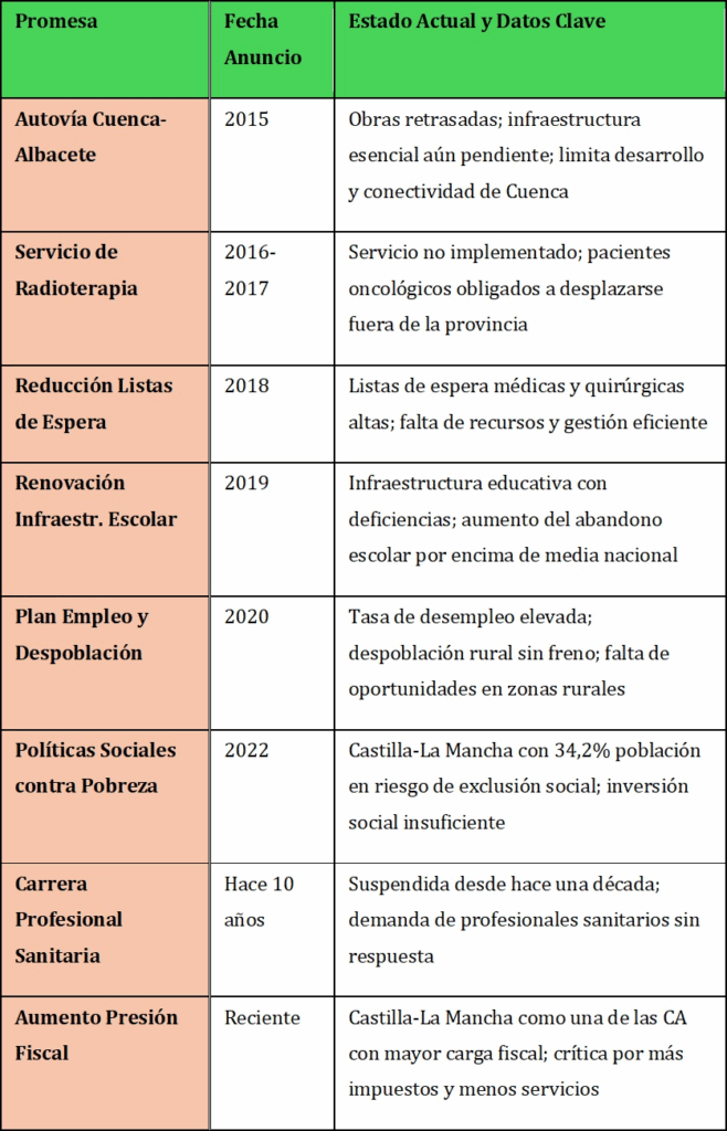 Cómo ejemplo síntesis de la inobservancia y la falta de palabra oficial se ha construido una tabla resumen de las promesas incumplidas del gobierno de Emiliano García-Page para la provincia de Cuenca, con fechas aproximadas y datos clave que reflejan el incumplimiento: