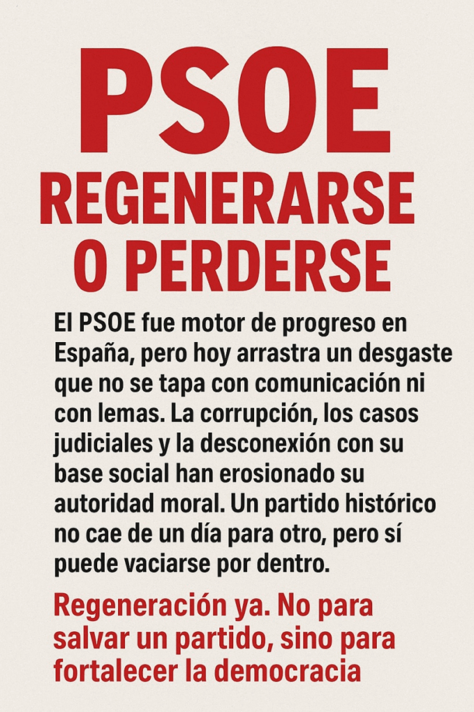 Regenerar no es maquillar. No basta con campañas frescas, anuncios emocionales o sustitución estética de portavoces. La regeneración exige cirugía interna, reformas profundas y una devolución de poder a la militancia y a la ciudadanía.