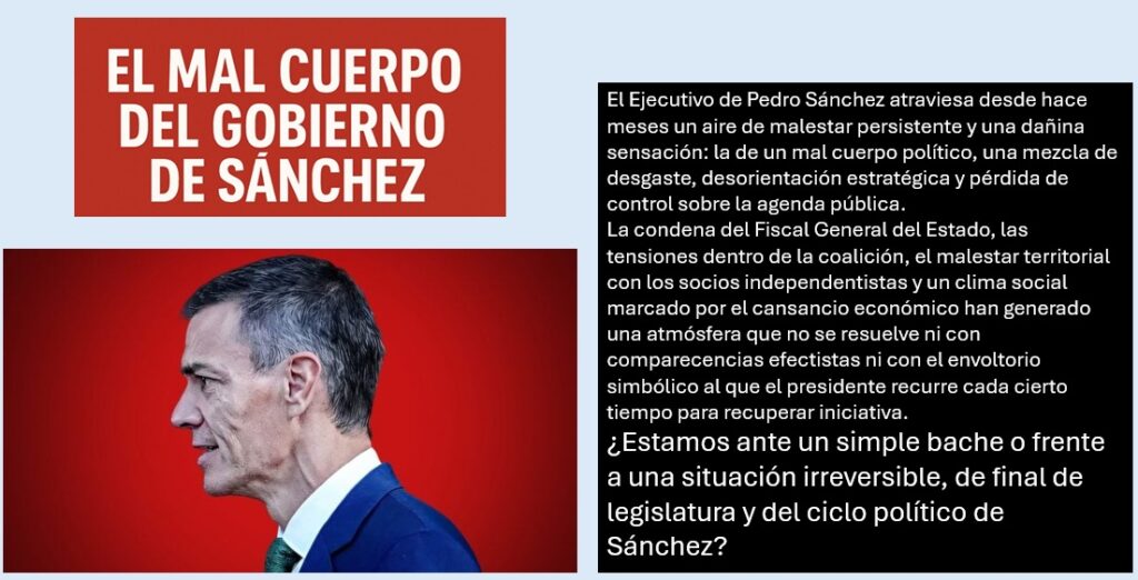 El “mal cuerpo” del Gobierno de Sánchez no es un accidente: es el síntoma de un equilibrio precario, de un proyecto político que ha perdido cohesión interna y coherencia externa. No es aún un final de ciclo, pero sí la señal de que, sin una rectificación profunda —institucional, estratégica y comunicativa—, la legislatura corre el riesgo de convertirse en un lento deterioro que ni la polarización ni el adversario podrán ocultar.