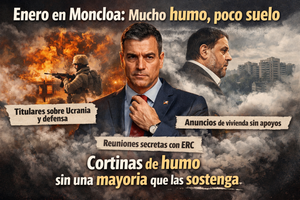 Por momentos, enero ha parecido en Moncloa menos el inicio de un año político que la continuación de un método. Un método ya conocido, ensayado y perfeccionado durante la última legislatura: cuando el Gobierno se queda sin suelo parlamentario, sin relato cohesionado o sin resultados tangibles, despliega humo. Mucho humo. Bien distribuido. Con agenda internacional, anuncios sociales sin respaldo y gestos calculados que ocupan titulares mientras los problemas de fondo siguen intactos.