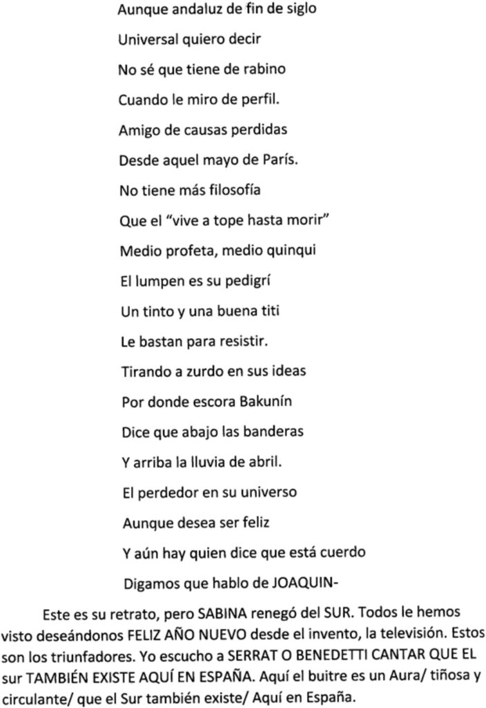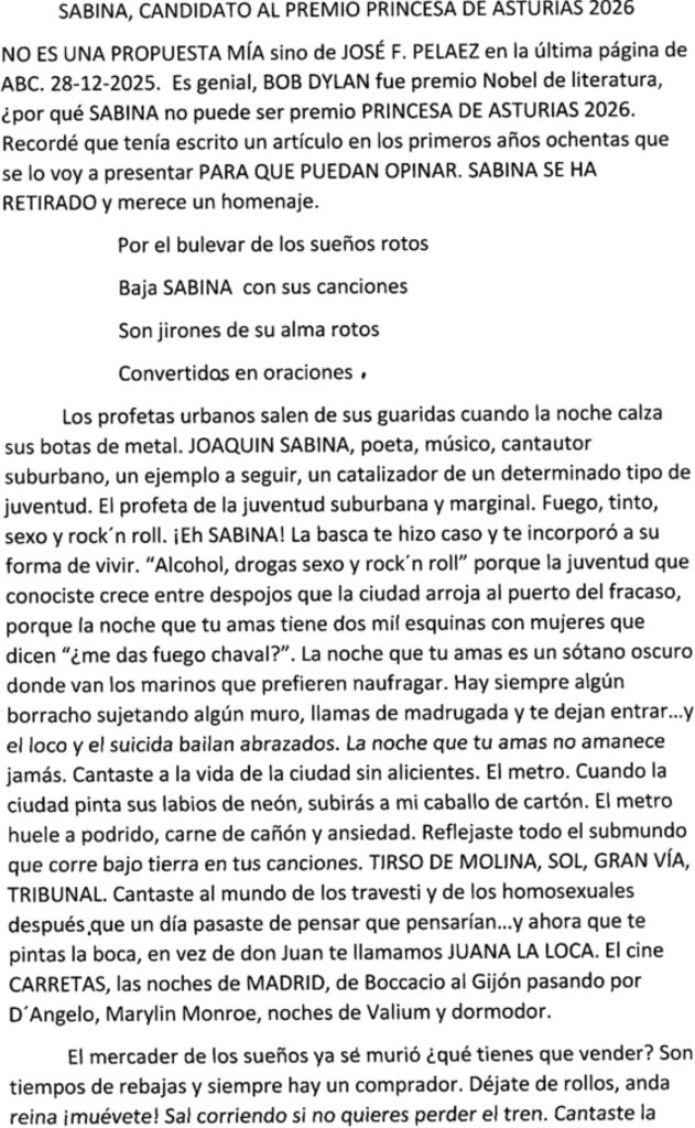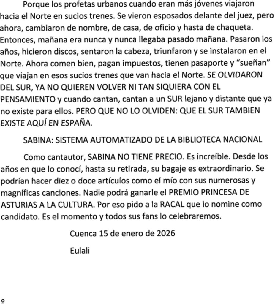 Sabina, candidato al Premio Princesa de Asturias 2026 (por Eulalio López Cólliga) Publicada el enero 17, 2026enero 17, 2026 por Juan Andrés Buedo Compartir