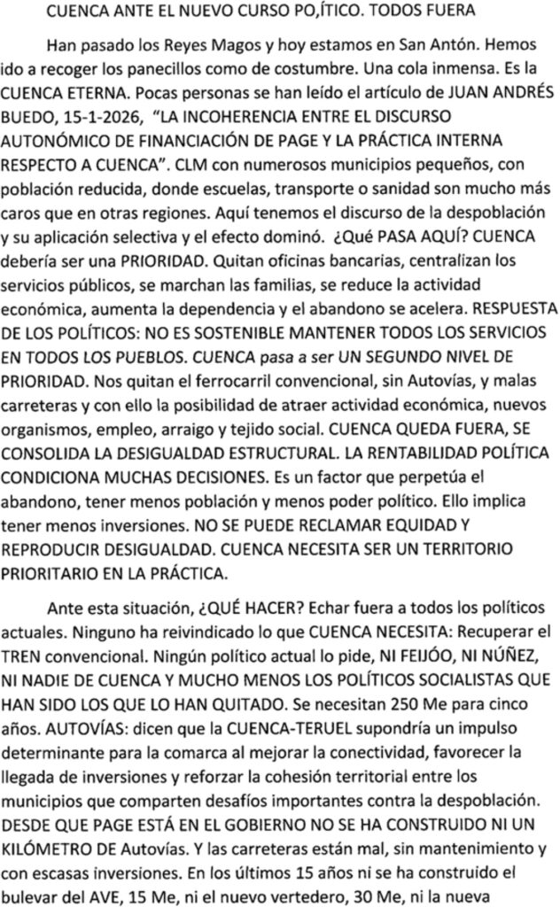 Cuenca ante el nuevo curso político. Todos fuera (por Eulalio López Cólliga) Publicada el enero 20, 2026enero 20, 2026 por Juan Andrés Buedo Compartir