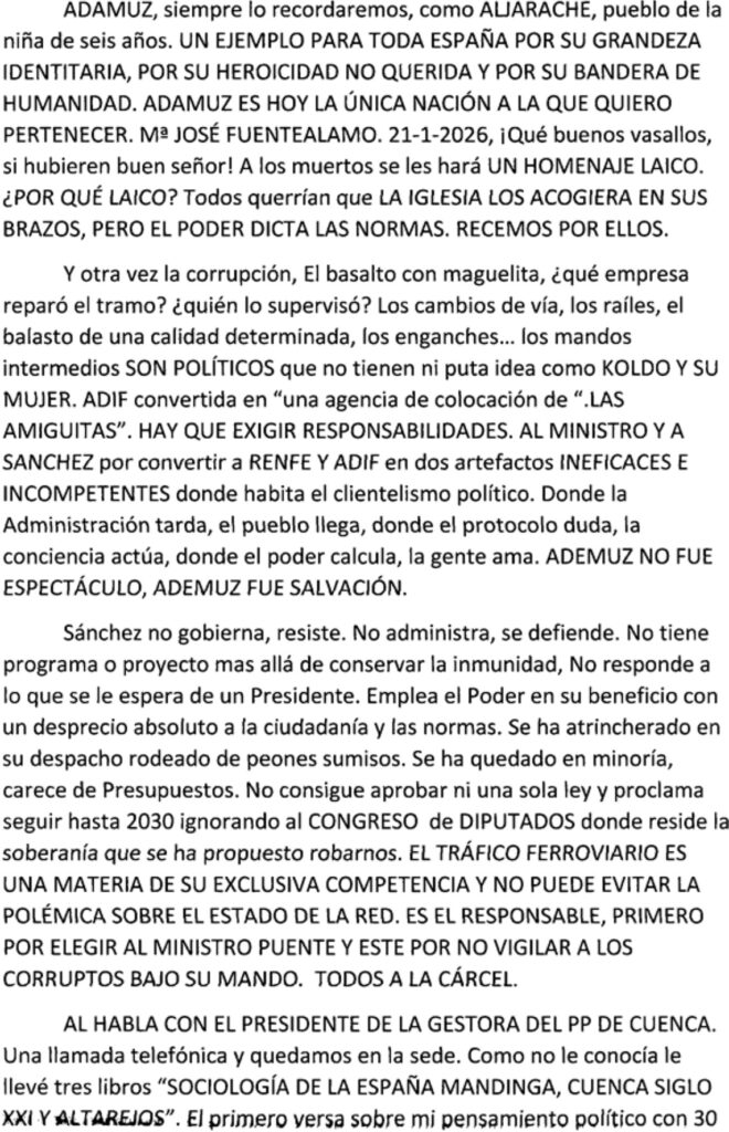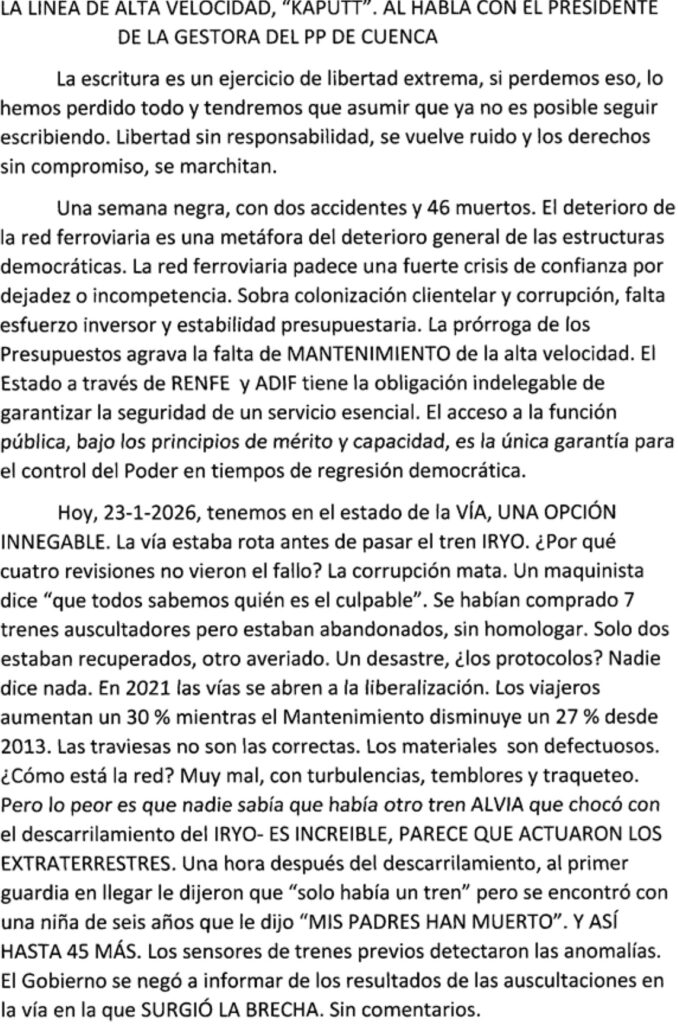 La línea de alta velocidad, «kaputt». Al habla con el presidente de la Gestora del PP de Cuenca (por Eulalio López Cólliga) Publicada el enero 25, 2026 por Juan Andrés Buedo Compartir