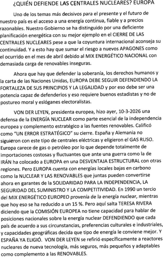 ¿Quién defiende las centrales nucleares?: Europa (por Eulalio López Cólliga) Publicada el marzo 28, 2026marzo 28, 2026 por Juan Andrés Buedo Compartir