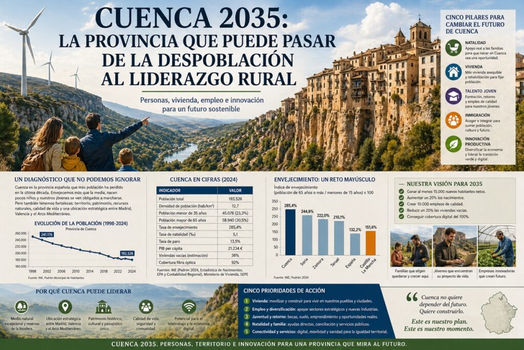 Durante demasiado tiempo, hablar de Cuenca ha significado repetir una colección de frases hechas: provincia envejecida, pueblos vacíos, falta de oportunidades, jóvenes que se marchan, servicios difíciles de sostener. Todo ello contiene parte de verdad, pero también encierra una trampa peligrosa: convertir una realidad compleja en una sentencia definitiva, como si el destino de este territorio estuviera ya escrito y solo quedara resignarse.